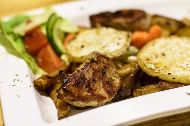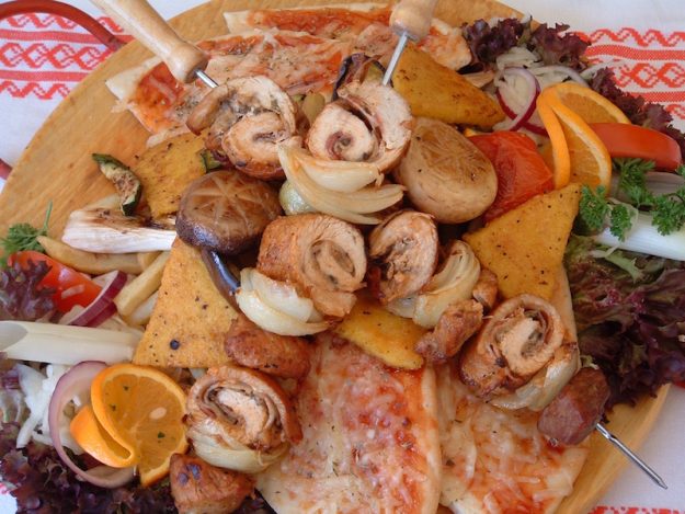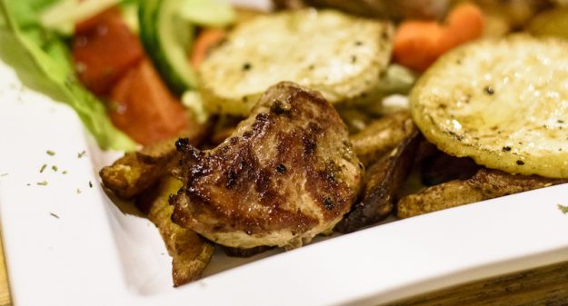 Grillezett BBQ sajt édesburgonya hasábokkal vegyes salátával